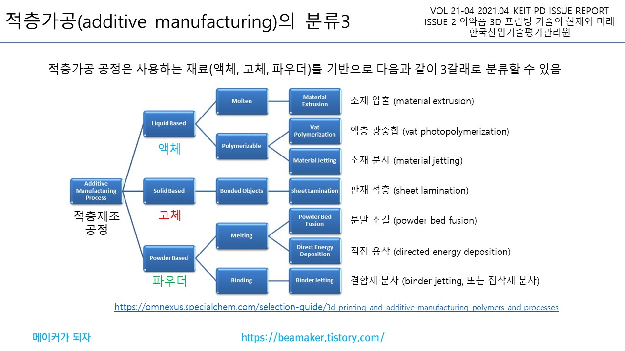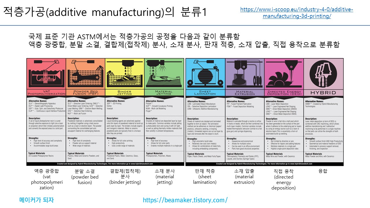 액층 광중합, 분말 소결, 결합제(접착제) 분사, 소재 분사, 판재 적층, 소재 압출, 직접 용착으로 분류한다.