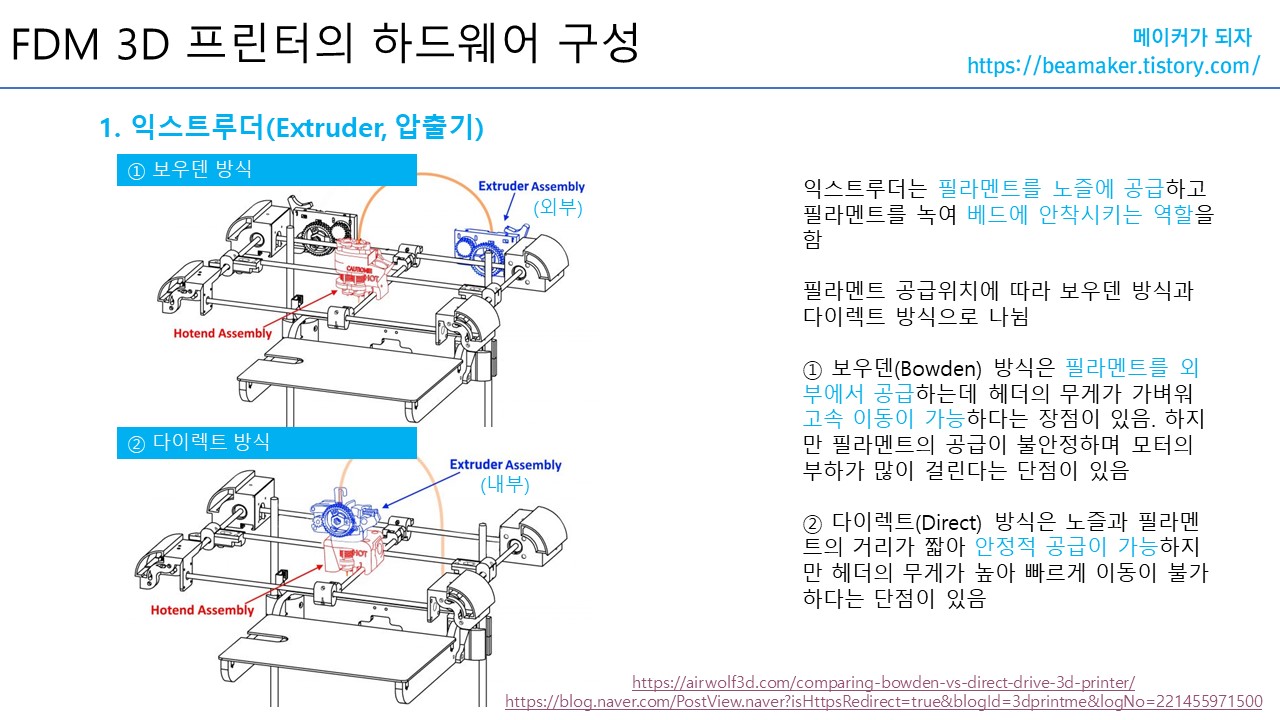 ① 보우덴(Bowden) 방식은 필라멘트를 외부에서 공급하는데 헤더의 무게가 가벼워 고속 이동이 가능하다는 장점이 있다. 하지만 필라멘트의 공급이 불안정하며 모터의 부하가 많이 걸린다는 단점도 있다.
