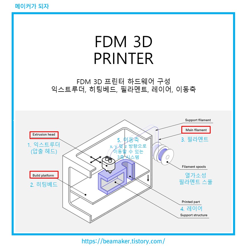 3D 프린터의 메인 하드웨어 구성은 아래 그림에서 보는 것처럼 익스트루더, 히팅 베드, 필라멘트 등으로 나눌 수 있다. 필라멘트(filament)는 다양한 열가소성 재질로 되어 있고 프린터 외부에 설치되어 있다.