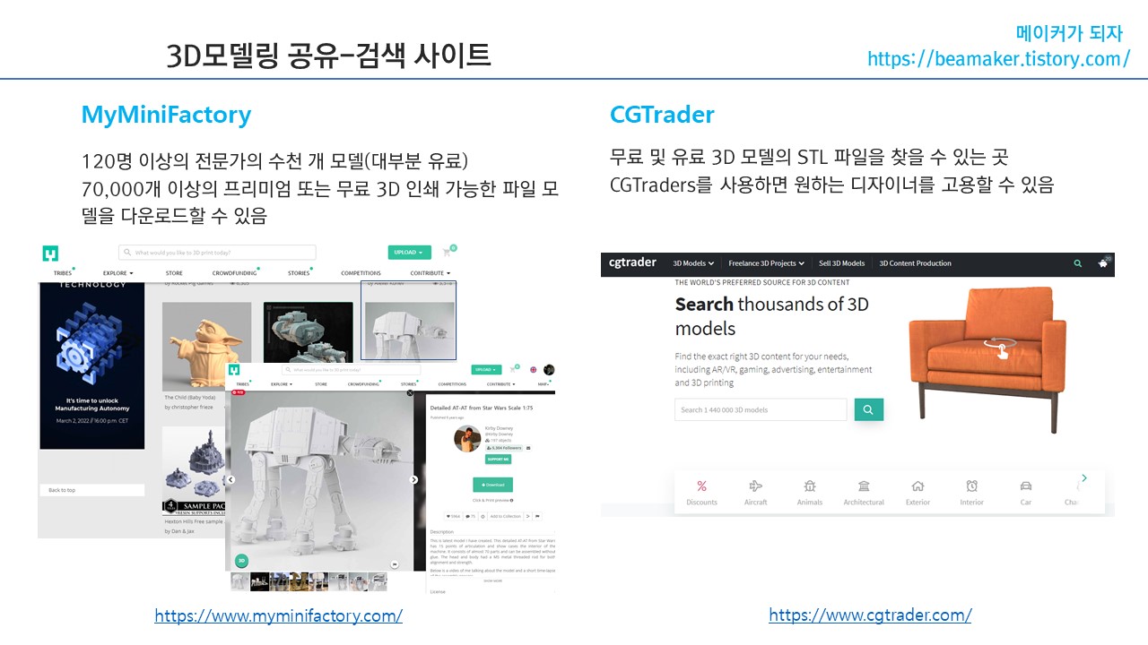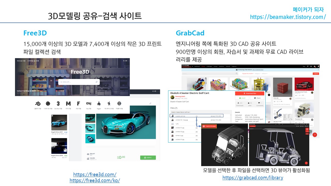 2022년 1월부터 준비한 3D모델링을 검색하고, 공유하고, 다운로드 받아서 3D 프린팅까지 할 수 있는 사이트 27개를 소개합니다. 모든 사이트가 유료와 무료가 혼재되어 있고, 다양한 3D모델파일들을 제공하고 있으니까, 사용자가 잘 선택해서 사용해야 하겠습니다.