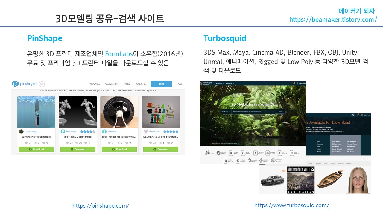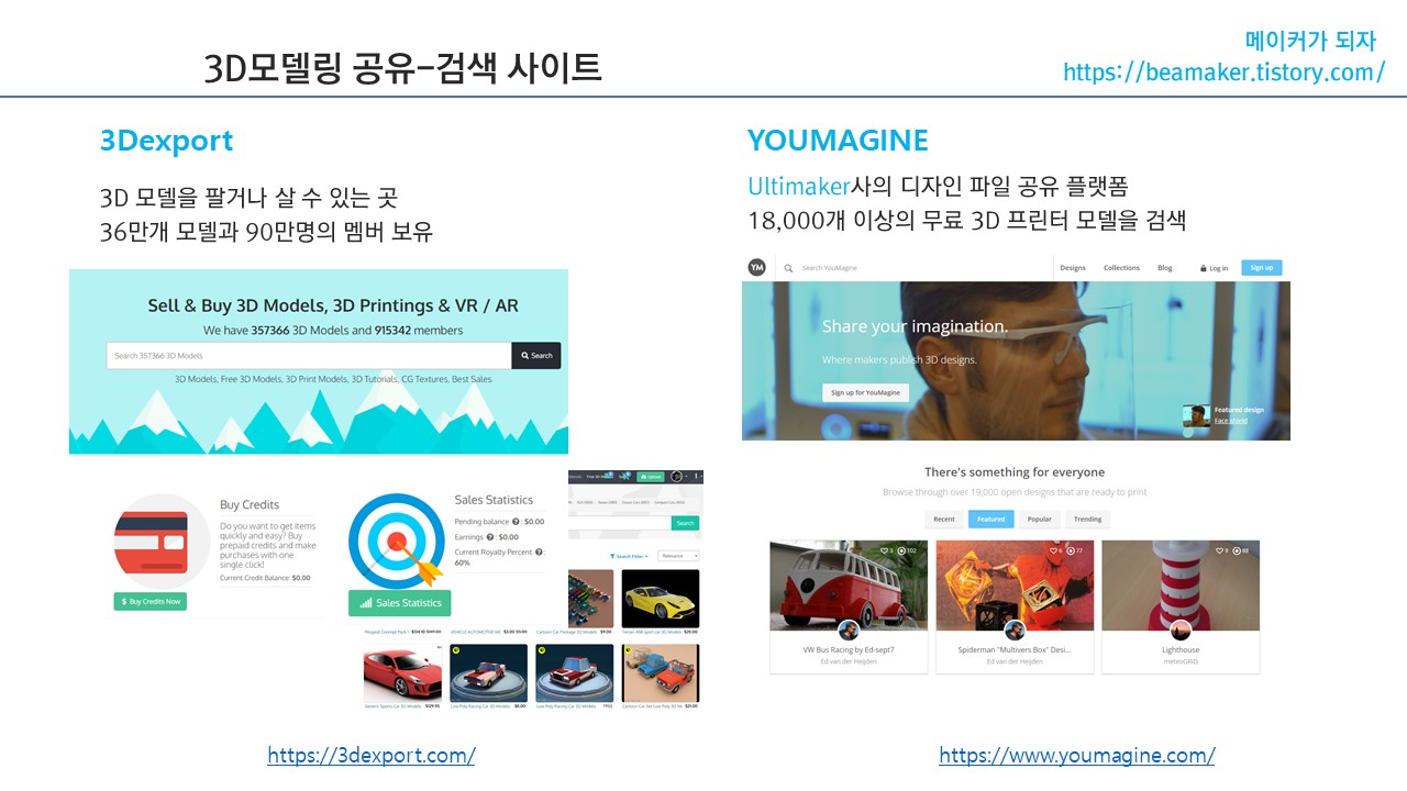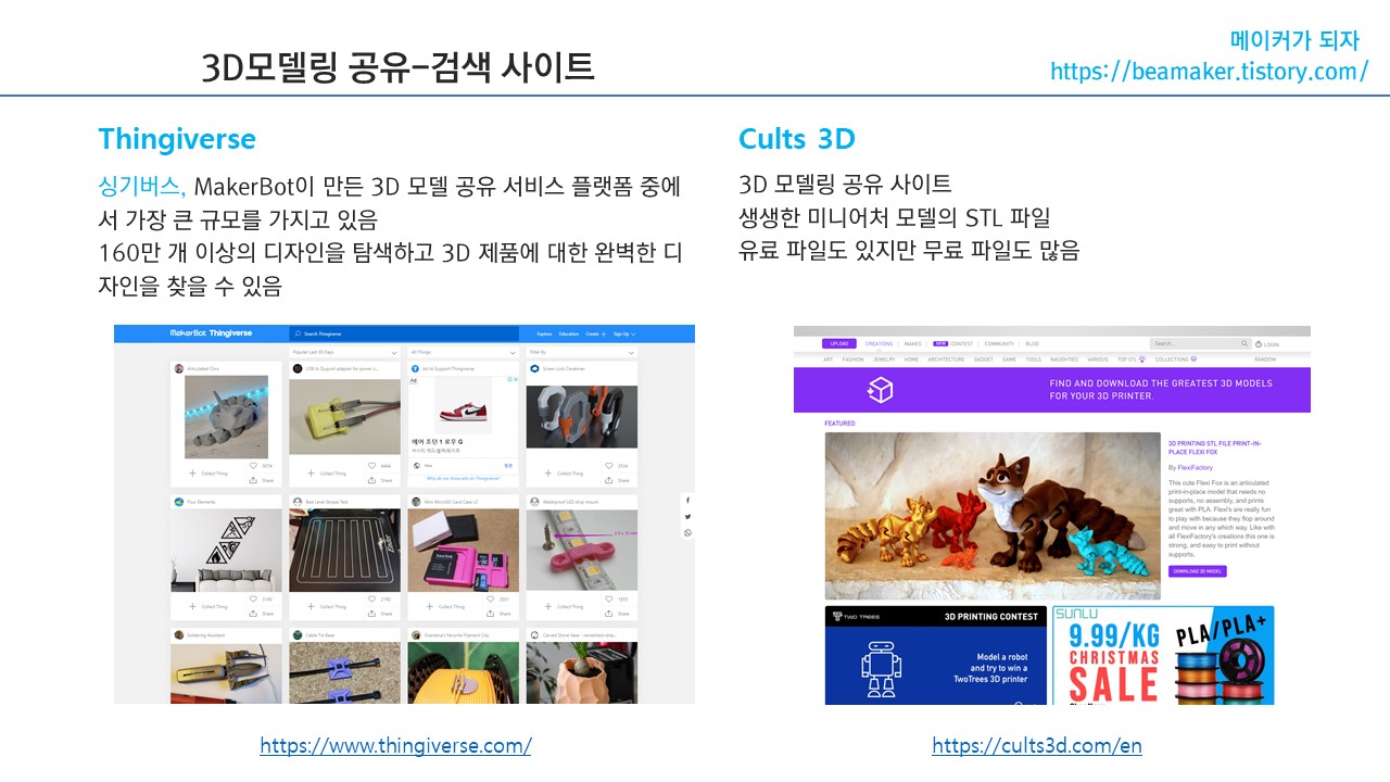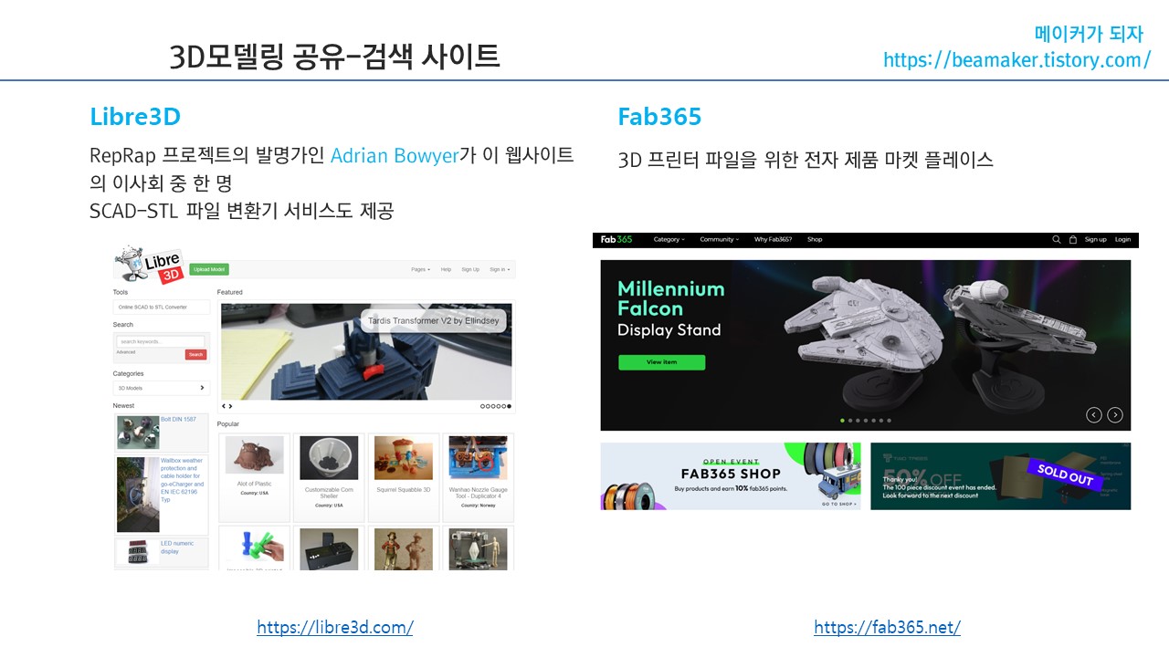 대부분의 3D프린터 제조업체와 3D모델링 회사들이 이러한 사이트들을 보유하고 있습니다.