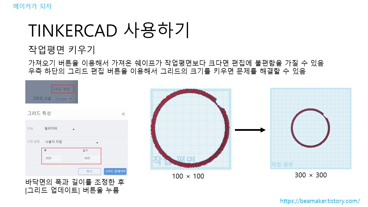 가져오기 버튼을 이용해서 가져온 쉐이프가 작업평면보다 크다면 편집에 불편함을 가질 수 있으므로 우측 하단의 그리드 편집 버튼을 이용해서 그리드의 크기를 키워서 해결할 수 있다. 아래 그림은 그리드를 3배로 키운 것이다.