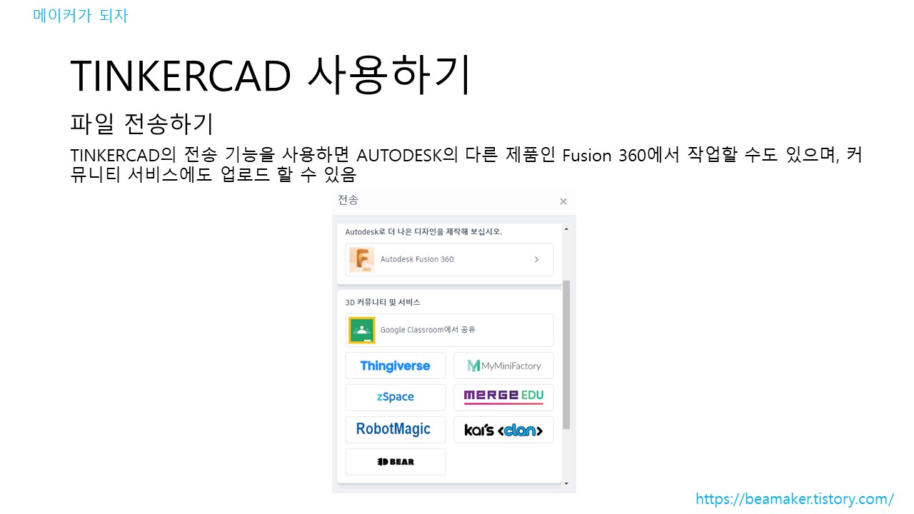 TINKERCAD의 전송 기능을 사용하면 AUTODESK의 다른 제품인 Fusion 360에서 작업할 수도 있으며, 커뮤니티 서비스에도 업로드 할 수 있다.