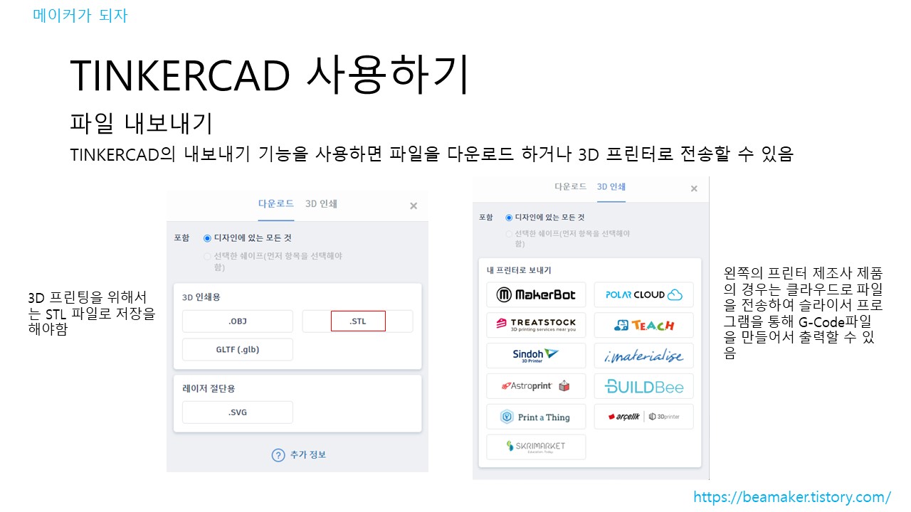 TINKERCAD의 내보내기 기능을 사용하면 파일을 다운로드 하거나 3D 프린터로 전송할 수 있다. 3D 프린팅을 위해서는 STL 파일로 저장을 해야 한다.